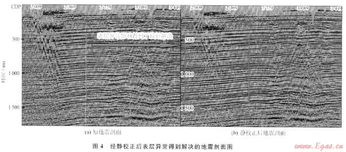 三湖地區(qū)地表相對平坦,以往該區(qū)資料處理采用高程靜校正,導致在很多近地表異常地區(qū)地面資料較差。通過近兩年的研究,認識到該區(qū)的速帶變化劇烈,存在較多的局部低降速帶異常。對靜校正方法的分析,最終確定了適合本區(qū)法——折射靜校正方法?;谀P图s束的折射靜方法能提供高質(zhì)量的中、長波長分量,同時,其短靜校正精度也較高。在實際靜校正工作中,主要了以下技術(shù)要點:①通過詳細的近地表結(jié)構(gòu)的整剖,準確建立近地表模型,為折射靜校正提供了合模型約束參數(shù);②通過對湖區(qū)、鹽堿地、鹽堿沼澤層含氣區(qū)等表層結(jié)構(gòu)對大炮初至質(zhì)量影響較大區(qū),采用處理手段提高初至質(zhì)量,提高了折射靜枝這些區(qū)域的應用精度;③通過提高折射波的識別、的折射分層、消除排列邊界效應的延遲時延拓,劉析反演模型,確定合理的靜校正計算標志層,最大地解決了該區(qū)存在的靜校正問題,消除了一些表常的影響(圖4)。