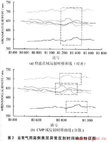 研究結(jié)果表明,不同位置單炮對于某一反射界面,表層異常和地下含氣異常的反射時間響應在檢波點域和CMP域是正好相反的。在檢波點域里,表層異常導致的反射時移是對齊的,在CMP域里是分散的;對于地下含氣異常,在檢波點域里,含氣異常導致的反射時移是分散的,在CMP域里是對齊的。實際資料應用表明(圖2),利用反射時間法識別表層異常與含氣異常是可行的,從而為甄別該區(qū)域的表層結(jié)構(gòu)異常提供了一種新的思路和方法。