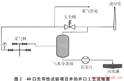 40口先導(dǎo)性試驗(yàn)項(xiàng)目井的井口流程中,煤層氣從井口套管中產(chǎn)出,然后進(jìn)入采氣管道,往閥組匯集。采氣管道前裝有安全閥,采氣管道壓力達(dá)到0.4MPa后,安全閥跳起,超壓氣體進(jìn)入放空管放空,避免系統(tǒng)超壓而產(chǎn)生危險(xiǎn)。產(chǎn)出水從油管中產(chǎn)出,首先經(jīng)過(guò)氣水分離器進(jìn)行分離,分離出來(lái)的氣體由放空管進(jìn)行放空,分離后產(chǎn)出水進(jìn)行流量計(jì)量,然后排放到井口污水池。該井口工藝流程如圖2所示。