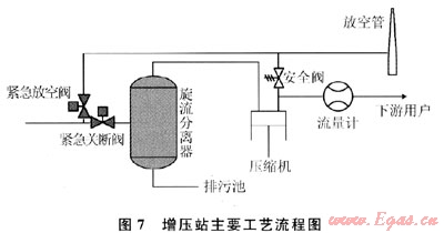 在分離器的入口管道上設(shè)有緊急關(guān)斷閥和緊急放空閥,當(dāng)出現(xiàn)事故時(shí)立即關(guān)閉緊急關(guān)斷閥,同時(shí)打開(kāi)緊急放空閥,使煤層氣進(jìn)入放空系統(tǒng)。當(dāng)壓縮機(jī)的進(jìn)氣量不能滿足壓縮機(jī)進(jìn)氣要求時(shí),打開(kāi)壓縮機(jī)的旁通閥,使壓縮機(jī)的出口煤層氣回流至壓縮機(jī)入口,進(jìn)行流量調(diào)節(jié)。壓縮機(jī)組的進(jìn)口匯管設(shè)有調(diào)壓放空系統(tǒng),壓縮機(jī)事故停機(jī)時(shí),導(dǎo)致壓縮機(jī)入口壓力增高,通過(guò)調(diào)壓放空閥將超壓部分的煤層氣及時(shí)放空去放空系統(tǒng),從而保持其他壓縮機(jī)組的正常運(yùn)行。該增壓站主要工藝流程如圖7所示。
