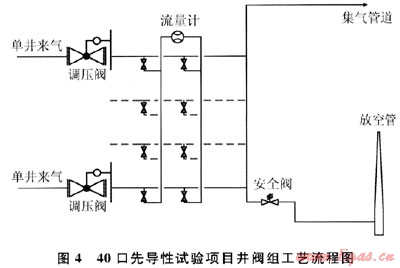 40口先導(dǎo)性試驗(yàn)項(xiàng)目井中,氣體進(jìn)入閥組后,首先經(jīng)過(guò)調(diào)壓閥調(diào)壓,壓力調(diào)整為0.2MPa,單井產(chǎn)氣可利用閥門(mén)倒換流程,進(jìn)行單井產(chǎn)氣輪換計(jì)量。所有氣體匯集到生產(chǎn)匯管后進(jìn)入集氣管道,輸至集氣站。在生產(chǎn)匯管上安裝有安全閥,當(dāng)壓力超過(guò)0.4MPa時(shí),安全閥自動(dòng)跳起。閥組中單井流量數(shù)據(jù)通過(guò)光纜傳輸至監(jiān)控中心。該工藝流程如圖4所示。