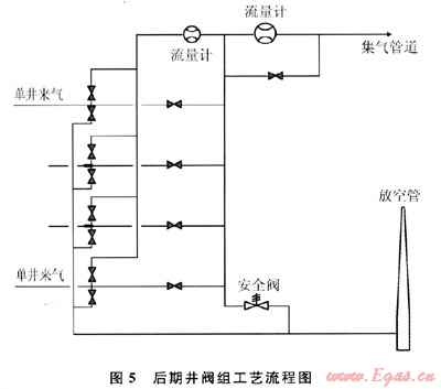 后期施工井的閥組取消了調(diào)壓閥,井口來(lái)的煤層氣到達(dá)集氣閥組后,進(jìn)入集氣閥組的生產(chǎn)匯管,經(jīng)總計(jì)量后直接進(jìn)入管道,整個(gè)集氣系統(tǒng)從井口到增壓站為1個(gè)封閉系統(tǒng),集輸壓力通過(guò)系統(tǒng)自動(dòng)調(diào)整平衡。單井煤層氣計(jì)量時(shí),首先進(jìn)入計(jì)量匯管,經(jīng)流量計(jì)計(jì)量后,再進(jìn)入生產(chǎn)匯管。每口井的采氣管道在集氣閥組都有放空流程,當(dāng)采氣管道檢修時(shí),打開(kāi)放空閥,進(jìn)入放空匯管,經(jīng)放空管放空。生產(chǎn)閥組匯管上設(shè)有安全閥,當(dāng)采、集氣管道壓力達(dá)到0.4MPa時(shí)安全閥起跳,將超壓部分氣體排放至放空管。該閥組工藝流程如圖5所示。