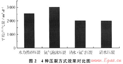 采用4種壓裂方式的壓裂效果對(duì)比如圖2所示。從圖2中可以看出:氮?dú)馀菽瓑毫研Ч詈?,壓裂井的平均產(chǎn)氣量為3 037.47m3/d;其次是活性水加砂壓裂壓裂的井,平均產(chǎn)氣量為2540.77m3/d;清水+氮?dú)鈮毫选⑶逅由皦毫研Ч嗖畈淮?,分別為2010.53m3/d和1998.88m3/d。