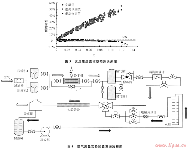 由于濕氣裝置所采用的標準表均可通過各自獨立的標準裝置實現(xiàn)良好溯源,因此能夠保證最終實驗數(shù)據(jù)的可靠性。氣相溯源中利用音速噴嘴作標準器,準確度為0.2%,氣體標準裝置不確定度為0.5%,用于標定濕氣實驗中準確度為1%的氣體標準表渦街流量計。液相可溯源到不確定度為0.05%的質(zhì)量法水流量標準裝置,通過該裝置實現(xiàn)對濕氣實驗中使用的液相標準表電磁流量計的標定,確保其準確度為0.2%。