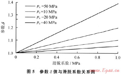 由圖5及式(10)可以看出:氣井無(wú)阻流量比值與滑脫系數(shù)(b)呈線(xiàn)性關(guān)系;滑脫系數(shù)(6)越大,供給邊界壓力(pe)越小,參數(shù)δ越大,氣體滑脫對(duì)氣井產(chǎn)氣能力影響越大;當(dāng)邊界壓力(pe)較低時(shí)(如pe≤5MPa),參數(shù)δ受滑脫系數(shù)(b)影響較大,氣體滑脫效應(yīng)對(duì)氣井產(chǎn)氣能力影響較大;而當(dāng)邊界壓力(pe)較大時(shí)(如pe≥10MPa),參數(shù)δ受滑脫系數(shù)(b)影響不大,氣體滑脫效應(yīng)對(duì)氣井產(chǎn)氣能力影響較小,這一計(jì)算結(jié)果與室內(nèi)巖心滲流實(shí)驗(yàn)結(jié)果一致。