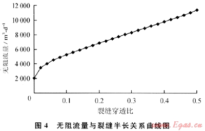 南式(9)的產(chǎn)能公式計(jì)算得到不同裂縫穿透比(Lf/re)對(duì)應(yīng)的氣井無(wú)阻流量如圖4所示,其中選用的原始儲(chǔ)層壓力為10MPa,即邊界壓力(pe)為10MPa,滑脫系數(shù)(b)為0.6MPa作為產(chǎn)能計(jì)算的參數(shù)值。
