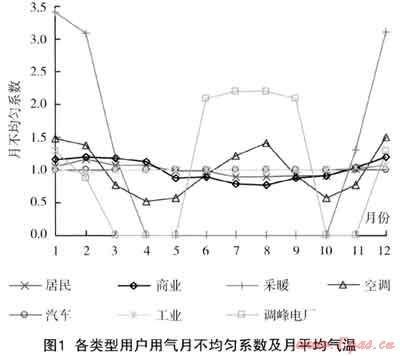 參考北京、天津、鄭州、廊坊等用氣特點(diǎn),得到我國(guó)北方地區(qū)各類(lèi)用戶(hù)典型月用氣不均勻系數(shù),如圖1所示。其中,采暖、空調(diào)、調(diào)峰電廠用戶(hù)用氣的季節(jié)不均勻性較強(qiáng),居民、商業(yè)、工業(yè)、汽車(chē)用戶(hù)用氣相對(duì)平穩(wěn)。空調(diào)、分布式能源、調(diào)峰電廠用戶(hù)除能消費(fèi)一部分低谷氣量外,還可以為電力系統(tǒng)削峰,減少峰電建設(shè)投入,同時(shí)提高供電可靠性,是電網(wǎng)的有益補(bǔ)充。
