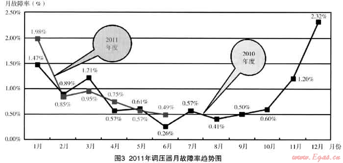 以下是2009年~2011年6月調(diào)壓器故障率的統(tǒng)計數(shù)據(jù):(如圖1~圖3)西安因冬季采暖鍋爐客戶較多,每年用氣波峰比為4:1,冬季由于上游的原因,經(jīng)常出現(xiàn)供不應(yīng)求的現(xiàn)象,中壓管網(wǎng)的供氣壓力和流量達不到設(shè)計要求,處于低壓高流速的運行狀態(tài),管道內(nèi)的粉塵會被帶到下游,對調(diào)壓器的正常運行帶來一定的影響。故公司在設(shè)定調(diào)壓器故障率KPI指標時,對冬季高峰供氣期間與平時有所不同,即每年4月~10月調(diào)壓器故障率不大于1.5%,11月~次年3月調(diào)壓器故障率不大于3%。