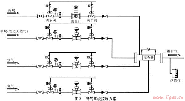 對(duì)于上述標(biāo)準(zhǔn)氣體,除組成外,更關(guān)心的是熱值,故在混合器出口設(shè)置熱值儀來檢測(cè)制取的標(biāo)準(zhǔn)氣體的熱值[5]。同時(shí)將檢測(cè)到的熱值反饋至控制系統(tǒng),對(duì)混氣比例進(jìn)行微調(diào),使整個(gè)控制系統(tǒng)成為閉環(huán)系統(tǒng)。