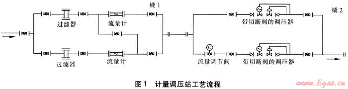 計(jì)量調(diào)壓站工藝流程是:接收高壓管網(wǎng)來氣,經(jīng)過濾、計(jì)量、流量調(diào)節(jié)、調(diào)壓后向下游中壓管網(wǎng)供應(yīng)天然氣。計(jì)量調(diào)壓站工藝流程見圖1。