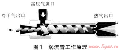 渦流管具有能量分離特性,高壓氣經(jīng)渦流管減壓處理后,將會(huì)在管中心產(chǎn)生一股冷流,在外側(cè)產(chǎn)生一股熱流。由于渦流管內(nèi)強(qiáng)烈的離心作用,中心的冷流氣體為干燥氣體,外側(cè)高溫氣體則集中了渦流管效應(yīng)(含節(jié)流效應(yīng))產(chǎn)生的所有液體。渦流管工作原理見圖1[4]。