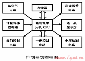 2、控制器:控制器一般由計量傳感器電路、微功耗單片機(jī)、微功耗閥門、電壓測試電路、防竊氣電路等部分組成(如圖所示)。具有精確記數(shù)功能、功能卡傳輸媒介功能、閥門自動處理功能、非法操作處理功能、欠壓處理功能、掉電處理功能、數(shù)據(jù)下載功能、數(shù)據(jù)顯示與聲音提示功能等。采用單片機(jī)對傳感器的脈沖進(jìn)行計量、分析處理,并驅(qū)動相應(yīng)的部件進(jìn)行控制。主要包括CPU、讀寫卡接口、顯示、計數(shù)等輔助部件,是IC卡燃?xì)獗淼暮诵脑O(shè)備。