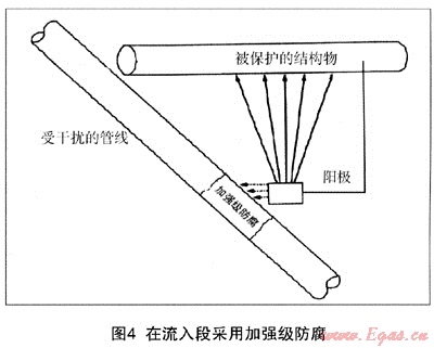 對于雜散電流腐蝕的防護,人們有個誤區(qū),往往會在流出段采用加強級防腐,因為這里的管道正在被腐蝕。這樣做的結果只是腐蝕區(qū)域的前后轉移,而無法避免腐蝕的發(fā)生,因為流入的電流總是要流出的。對于舊管道維修,由于通常只修補大的破損點,使得腐蝕電流更集中在未修補的小破損點處,形成“大陰極小陽極”的嚴重腐蝕局面,反而加快了穿孔的速度。正確的做法是,要在流入段(靠近其他被保護構筑物的輔助地床處)采用加強級防腐,盡力避免雜散電流的流入(圖4)。