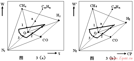 城鎮(zhèn)中占絕對(duì)多數(shù)的民用燃具是大氣式燃?xì)庥镁?。衡量大氣式燃?xì)庥镁哒9ぷ鞯闹匾闹笜?biāo)是:不發(fā)生離焰、回火、黃焰、煙氣中CO不超標(biāo)和不結(jié)碳等。影響這些現(xiàn)象的燃?xì)庑再|(zhì)是華白數(shù)與燃燒速度,以及燃具的構(gòu)造等。為了更具體顯示燃具適應(yīng)域,取一個(gè)以華白數(shù)W為縱坐標(biāo),以燃燒速度S為橫坐標(biāo)的坐標(biāo)圖。圖上的每一個(gè)坐標(biāo)點(diǎn),都代表具有Wi與Si 性質(zhì)的燃?xì)?。各種單一的氣體(如CH4、H2、CO、N2)都可以在圖上找到位置,當(dāng)然基準(zhǔn)氣O也有一個(gè)坐標(biāo)點(diǎn),見(jiàn)圖1。用一個(gè)燃具在不做任何調(diào)整的條件下,分別用基準(zhǔn)氣和CH4、H2及CO單一氣體混合配氣進(jìn)行試驗(yàn),可以求得CO超標(biāo)曲線1、離焰曲線3及回火曲線2。圖1中1、2、3曲線圍成的范圍就是該燃具的適應(yīng)域。燃具的適應(yīng)域是代表燃具性能的重要指標(biāo)。嚴(yán)格地說(shuō)燃具正常工作還包括不黃焰、不結(jié)碳等要求,需要用相應(yīng)的指標(biāo)來(lái)驗(yàn)證。但是一般來(lái)說(shuō),對(duì)于大氣式燃具,只要CO 過(guò)關(guān),就很少產(chǎn)生黃焰和結(jié)碳的現(xiàn)象。不過(guò)天然氣中H2含量多時(shí),需要關(guān)注析碳。液化石油氣混空氣要注意黃焰現(xiàn)象。