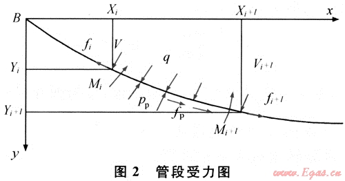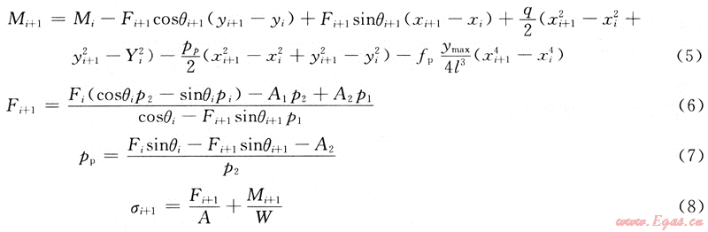 式中:A1=q(yi+1-yi);A2=q(xi+1-xi);p1=yi+1-yi+(xi+1-xi)tanφp;p2=-(xi+1-xi)+ (Yi+1-yi)tanφp;Fi為第i點管端軸力;Mi為第i點管端彎矩;σi為第i點管端應力;θi為第i點管端各點轉(zhuǎn)角;W為管道彎曲截面系數(shù)。