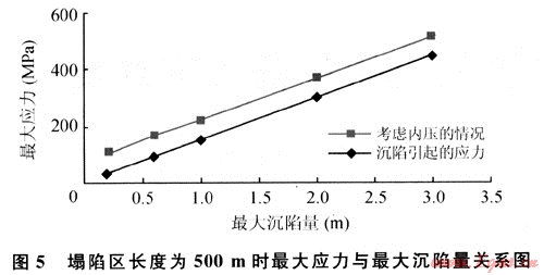 2) 按開采沉陷引起的管道中最大應力值、內(nèi)壓與開采沉陷引起的管道中最大應力值組合分別計算,結(jié)果見圖3~5。