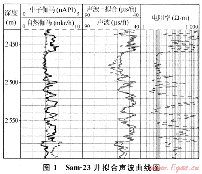 統(tǒng)計數(shù)學(xué)模型的復(fù)相關(guān)系數(shù)達0.89,統(tǒng)計量F=7834,表明所建立的人工擬合方程是“高度顯著”的;再將人工擬合的聲波曲線與實際測量的聲波曲線進行對比(圖1),二者形態(tài)一致性良好,曲線大部分近于重合,表明選用人工擬合聲波曲線大體上可以滿足計算地層孔隙度的基本需要。