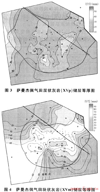 在儲層橫向?qū)Ρ鹊幕A(chǔ)上,編制了層狀灰?guī)r(XVp)、塊狀灰?guī)r(XVm)有效儲層等厚圖(圖3、4),層狀灰?guī)r有效儲層厚度0~20m,不完全受構(gòu)造控制,在Sam-17、Sam-15、Sam-6井區(qū)還受巖性控制;總體上高值區(qū)位于構(gòu)造高部位,同時在構(gòu)造高部位又分為東、西兩個高值區(qū)(厚度大于15m),而中部有一個較明顯的低值區(qū)。塊狀灰?guī)r有效儲層厚度0~90m,完全受構(gòu)造控制。高值區(qū)位于構(gòu)造高部位,最厚區(qū)在Sam-123~Sam-51~Sam-53井一線(厚度大于70m)。