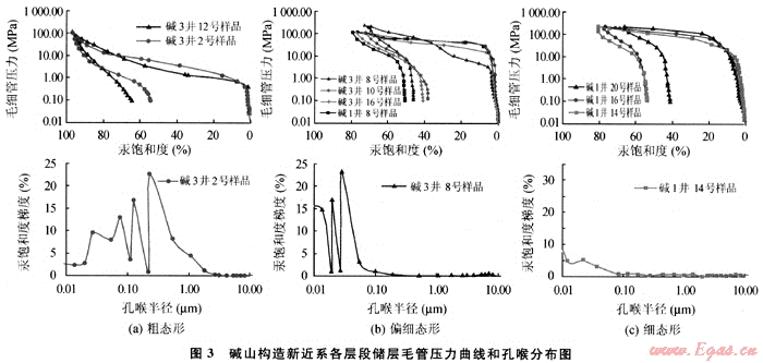儲層孔隙結(jié)構(gòu)分為粗態(tài)型、偏細態(tài)型和細態(tài)型3種類型,整體排驅(qū)壓力較高(圖3),儲層主要流動喉道半徑較小,喉道孔徑主要分布在小于0.1μm的范圍,屬小孔-微細喉型,喉道系統(tǒng)較復雜,均勻程度差,分選不好,孔喉比大,喉道相當彎曲,因而排驅(qū)壓力和飽和度中值壓力高,退出效率低,充分表明儲層孔隙結(jié)構(gòu)差,故儲層滲透能力差,為差儲集層,不利于油氣的運聚。從縱向上整體來看滲流能力由上向下逐漸變差(表2)。根據(jù)裘亦楠、王允誠等確定的砂巖儲層分類評價方案所示,表明堿山構(gòu)造各儲層屬Ⅱ3-Ⅳ類儲層,即中下等到很差-差類儲層,這也是該區(qū)沒有形成規(guī)模聚集的主要原因之一[8~9]。