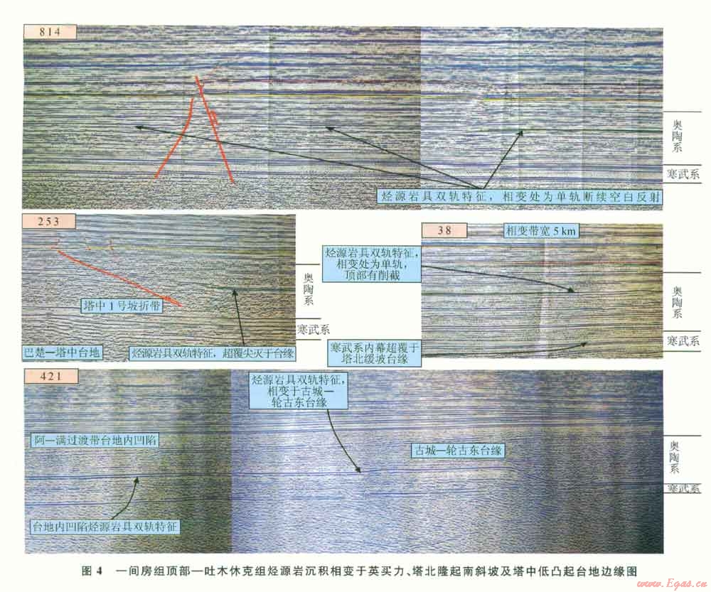 但是,通過對經(jīng)過羊屋2井地震剖面(測線419)的精細分析(圖3),發(fā)現(xiàn)在羊屋2井南部3 km處存在同相軸Tg5-1及其下面的“雙軌”變“單軌”的巖性相變反射,即代表著上奧陶統(tǒng)良里塔格組石灰?guī)r頂面Tg5-1之下的強反射軸發(fā)生相變。同時經(jīng)多條地震剖面相互閉合、連接確認,此發(fā)生相變的“雙軌”同相軸與過塔中29井烴源巖發(fā)育位置的強相位反射顯示的是同一套地層發(fā)射。據(jù)此認為,中上奧陶統(tǒng)一間房組頂部—吐木休克組烴源巖沉積相變于塔北隆起南斜坡羊屋2井南3 km處的碳酸鹽巖臺地內(nèi)緩坡。