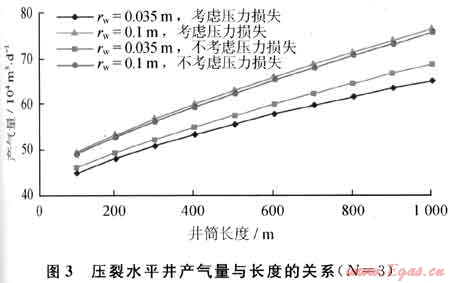 中東某氣藏氣體相對(duì)密度0.58,井筒管壁粗糙度0.16mm,氣層厚度8.25m,水平滲透率10.31mD,地層壓力28.4MPa,井底壓力24.29MPa,地層溫度103.1℃,井筒半徑0.05m,氣體黏度0.023mPa·s,氣體壓縮因子1.014,裂縫半長(zhǎng)105.3m,裂縫滲透率31.56mD,裂縫寬度0.0055m,井筒長(zhǎng)度420m。根據(jù)上面的公式計(jì)算,當(dāng)壓開3條裂縫并考慮水平井筒內(nèi)的壓力損失時(shí),產(chǎn)氣量為53.75×104m3/a,若不考慮水平井筒的壓力損失,其產(chǎn)氣量為55.7567×104m3/a。由此可以看出,井筒內(nèi)壓力損失的存在的確會(huì)降低水平井的產(chǎn)量。