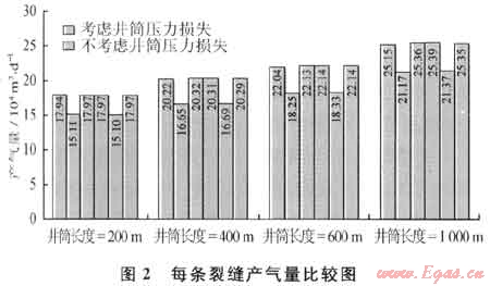 圖2為壓開3條裂縫的水平井在不同井筒長(zhǎng)度情況下每條裂縫產(chǎn)氣量的比較:端部裂縫的產(chǎn)氣量高于中部裂縫的產(chǎn)氣量;不考慮井筒內(nèi)的壓力損失時(shí),裂縫的產(chǎn)氣量呈對(duì)稱分布;考慮井筒內(nèi)的壓力損失時(shí),指端裂縫的產(chǎn)氣量有所下降,但仍高于中部裂縫的產(chǎn)氣量。