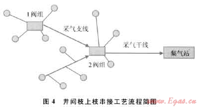 首次在煤層氣氣田工程中采用了多種井間串接方式,單井不必直接敷設(shè)進(jìn)站,而是根據(jù)地形、地貌、井型等情況,通過采氣支管把相鄰的幾口氣井靈活串接到采氣干管,匯合后集中進(jìn)站。這種井間枝上枝的串接工藝縮短了采氣管線長度,增加了集氣站的集氣半徑,降低了管網(wǎng)投資,減少了對植被的破壞,提高了采氣管網(wǎng)對氣田滾動(dòng)開發(fā)的適應(yīng)性。圖4為井間枝上枝串接工藝流程簡圖。