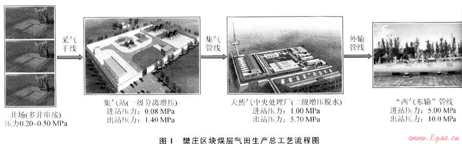 根據(jù)國家大力發(fā)展新能源的戰(zhàn)略要求,“十一五”期間中國石油天然氣股份有限公司在山西沁水盆地樊莊區(qū)塊開始規(guī)模開發(fā)煤層氣田,該區(qū)域位于山西省東南部、太行山西麓沁水盆地南部,行政隸屬于山西省晉城市沁水縣。樊莊區(qū)塊煤層氣田產(chǎn)能建設(shè)目標(biāo)為6.0×108m3/a,地面系統(tǒng)共建采氣井400余口、集氣站6個(gè),天然氣中央處理廠一期建設(shè)規(guī)模為10×108m3/a。2009年9月15日,天然氣中央處理廠產(chǎn)品氣開始源源不斷地輸送至“西氣東輸”管網(wǎng),樊莊區(qū)塊煤層氣田6.0×108m3/a產(chǎn)能建設(shè)完成,我國第一個(gè)規(guī)?;_發(fā)、商業(yè)化運(yùn)營的煤層氣示范工程進(jìn)入試生產(chǎn)階段。圖1為樊莊區(qū)塊煤層氣田生產(chǎn)總工藝流程圖。