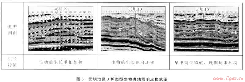 通過對元壩地區(qū)鉆錄井和三維地震資料的綜合分析,依據(jù)生物礁特征劃分提出了3種類型的生物礁:垂向加積生物礁、側(cè)向遷移生物礁及早期生物礁(圖3),3種生物礁的生長與儲層發(fā)育均具有顯著特點。在該認識的指導(dǎo)下,提高了生物礁描述及井位優(yōu)選精度,保證了勘探部署井的高成功率。