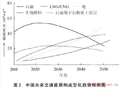 在向低碳能源轉型的歷史時期,目前還占世界一次能源消費首位(35%)、主要用于交通燃料的石油大部分將在2050年被其他低碳清潔能源所替代。圖2是中國未來交通能源構成變化趨勢預測圖。事實上,2011年3月21日歐盟委員會已向歐洲議會提出了“2050年禁止使用汽柴油車,2030年汽柴油車使用減半”的法案。IEA估計生物燃料將于2040年成為主力航空燃料,到2050年其應用將占全球運輸業(yè)的25%。國際天然氣汽車協(xié)會預計世界天然氣交通工具將以年增17.8%的速度增長,到2020年將達6500萬輛,約為2005年汽車總量的9%。隨著科技進步的加速,上述轉型的進程很可能還將加快。