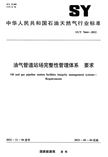 SY/T 7664-2022 油氣管道站場(chǎng)完整性管理體系 要求:本文件規(guī)定了油氣管道站場(chǎng)構(gòu)建完整性管理體系的基本要求,用于指導(dǎo)企業(yè)建立站場(chǎng)完整性管理體系,實(shí)施完整性管理工作,提高設(shè)備設(shè)施安全性,可靠性、經(jīng)濟(jì)性運(yùn)行水平,持續(xù)改進(jìn)管理績(jī)效。